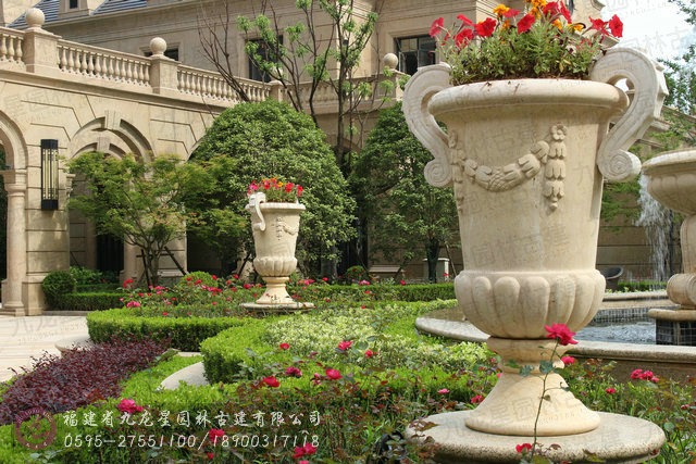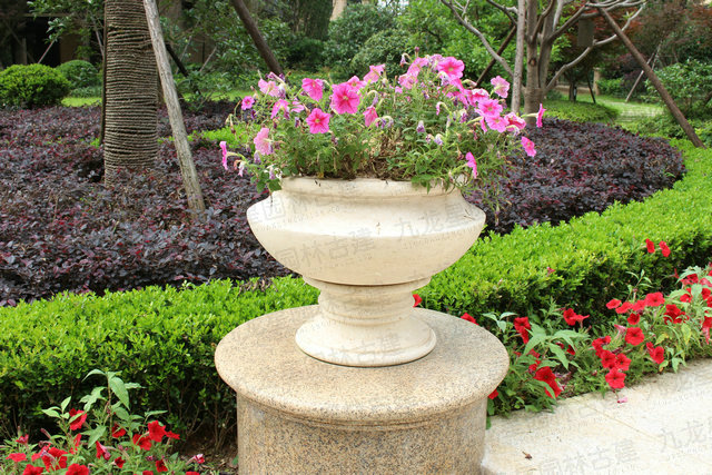 石材花缽可放在臺階或小區入口兩側,屹立于景墻之上,廣場的中心,水池邊上,單元入口或擺放于街邊。既可以獨自成景,與水中的倒影交相輝映,又可以和噴泉一道形成優美的旋律。