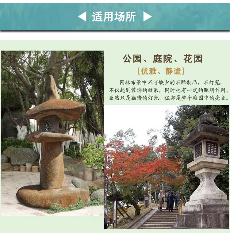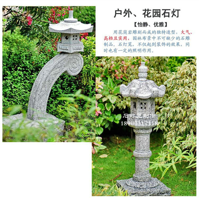 石燈籠是日本石文化的重要內容之一,也是近年來我國出口日本石制品的一個重要品種。石燈籠在日本有著非常悠久的歷史。在佛前獻燈火是佛教的重要禮儀之一,自奈良時代 (公元 710~ 794年 )起日本在修建寺院時就開始在寺院的正面建造石燈籠以保護向寺院所獻的燈火。日本現存的最古老的石燈籠是奈良時代的當麻寺石燈籠,距今已有一千多年的歷史了。到了江戶時代 (公元 1603~ 1867年 )石燈籠在日本已廣為流傳,一些寺院里造型精美的石燈籠被作為樣本模仿雕刻以至形成了石燈籠的各種形式。石燈籠被用于園林、庭院的裝飾始于十六世紀晚期的安土桃山時代,當時由于茶道的大發展,石燈籠常被作為茶室的一種露天裝飾物而廣泛進入庭院裝飾。隨著石燈籠用途的改變,石燈籠的樣式也就更加多樣化了,例如出現了三腳或四腳的雪見燈籠,同時對竿和笠的部分也給予新的設計,石燈籠的式樣由模仿進入創新。現在日本的石燈籠除了少量用于寺院神社以外,大多數的石燈籠是用于庭院、園林裝飾使用。