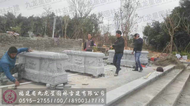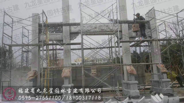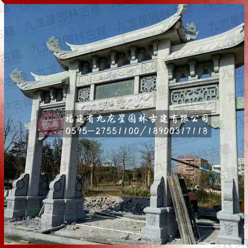 石雕牌樓材質用料:石鼓、柱座石材G654#;窗花、花托、石拱青石;主體結構石材G606#