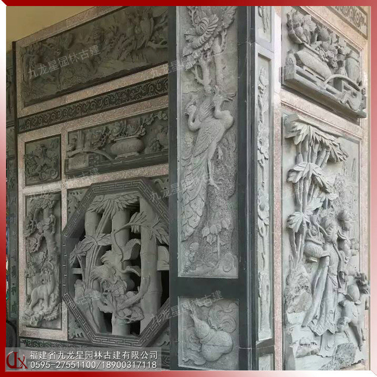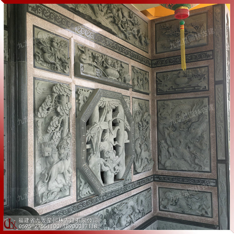 石雕浮雕壁畫在古建筑外墻中占據重要的地位。古建筑的石雕浮雕在內容、形式和材質上與圓雕一樣豐富多彩。建筑石雕浮雕常見的材料有青石、花崗巖、白麻、芝麻黑、羅源青、古田青等等。浮雕的雕刻技藝和表現體裁與圓雕基本相同。